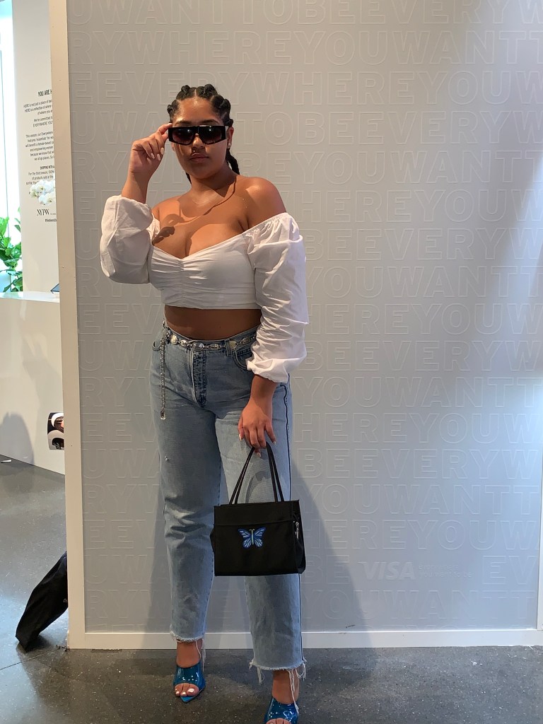 To this Fashion show I wore a simple look because it was last minute and I had classes before the show! I wore some denim with a cute top and dressed it up with a butterfly bag and blue clear heels!