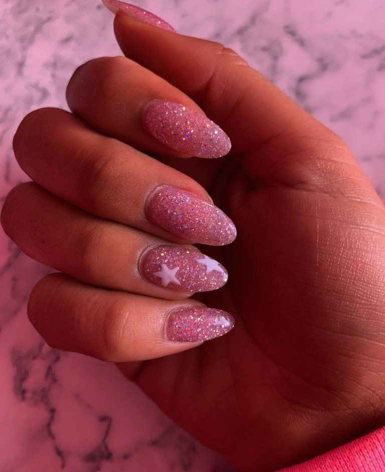 I was so undecided about what to do on my nails but I love sparkles! I went with a simple pink nail with sparkles and white stars! These are my natural nails done with powder and gel on top!
